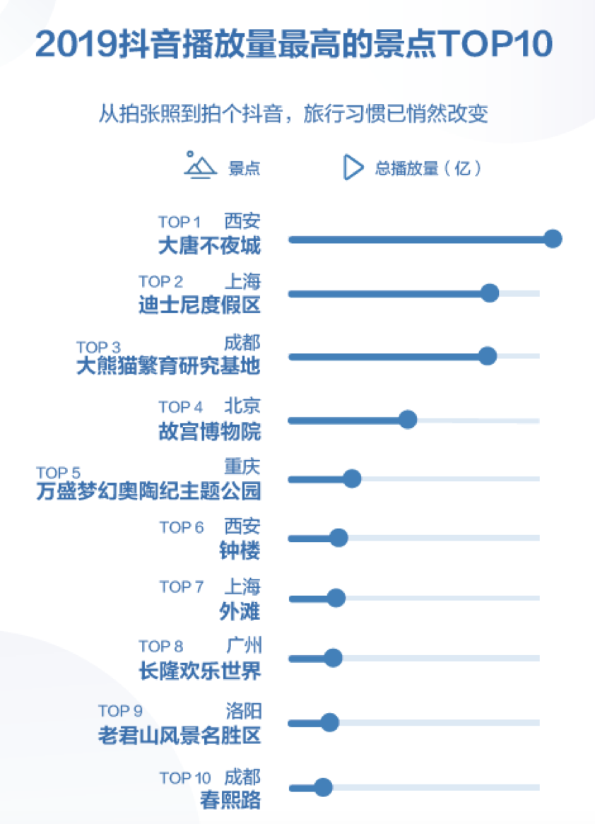 其中,23岁的抖音用户@皮卡晨化身“不倒翁小姐姐”,使#大唐不夜城不倒翁#相关视频播放量超23亿次,西安大唐不夜城景点位列2019抖音播放量最高的景点首位,其次为上海迪士尼度假区和成都大熊猫繁育研究基地。