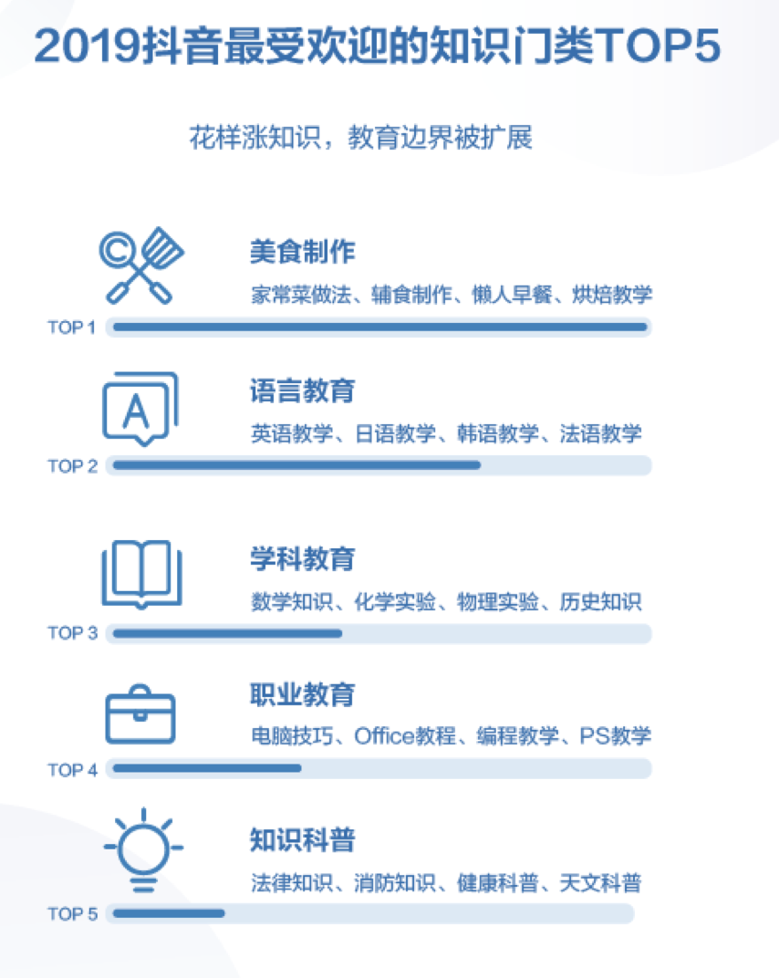 除此以外,知识类视频也正成为抖音内容生态的重要组成部分。2019年,抖音万粉知识创作者发布1489万个视频,1.3亿用户听过@向波老师的化学课。最受欢迎的知识门类是美食制作,人们在抖音学习家常菜、辅食、懒人早餐和烘焙等烹饪技巧,其次为语言教育、学科教育、职业教育和知识科普。