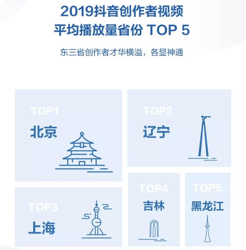 根据报告,抖音上不同年龄段用户最爱拍摄的内容不尽相同,00后喜欢拍摄二次元相关视频;90后用户喜欢拍摄风景,记录旅行中的山河大海;80后喜欢拍摄亲子视频,分享亲子的新知与乐事;70后喜欢拍摄美食类视频。在创作者视频平均播放量排行榜上,黑龙江、吉林、辽宁均上榜前5名。
