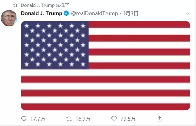 白宫表示,空袭是在特朗普总统的指导下进行的。特朗普在袭击发生几小时后在Twitter上发布了一张美国国旗的图像。
