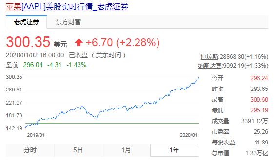 进入2020年,全球主要股指普涨,其中美国股市的涨幅牵动不少投资者的心。在众多科技股当中,苹果股价突破300美元迎来新年开门红。1月3日,美股2020年首个交易日,苹果股价收涨2.28%创下历史新高,报300.350美元,首次突破300美元大关,总市值达1.33万亿。