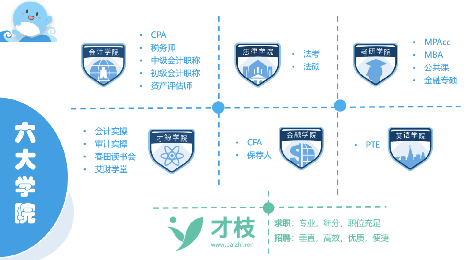 BT学院定位为“一所有温度的在线财经大学”,除了各类型考证教学以外,还计划做实操培训、理财教育和财经类求职产品,从大学生考研、到毕业后考证、再到实操能力提升,最后找(换)工作,形成财经大学的闭环。2019年已上线旗下财经招聘网站“才枝”。