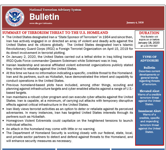 事实上,在美军定点清除苏莱曼尼的第二天,国土安全部就已经发出警告,呼吁美国公共和私营部门提高戒备。国土安全部表示,“伊朗有能力对美国的关键基础设施进行具有临时破坏性的网络袭击”。