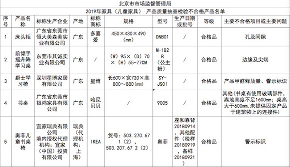 其中,宜家一款奥菲儿童书桌椅上榜。该批次不合格产品,标称由宜家瑞典有限公司生产,境内授权代理机构为宜家(中国)投资有限公司,标称商标为IKEA,货号为503.270.67 1(2)、503.207.67 2(2),生产日期为20180914。不合格项目为警示标识。