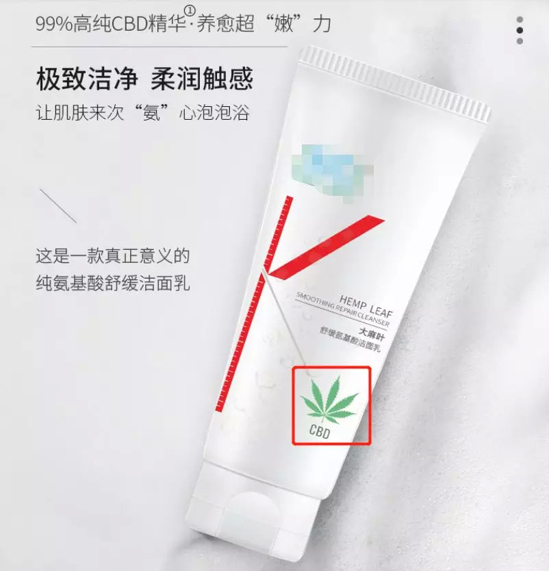 例如,天猫某品牌旗舰店的一款“大麻叶舒缓氨基酸洁面乳”产品,宣称富含99%高纯度CBD,主要针对敏感肌痘痘肌,该品牌以“CBD化妆品”自居,并在包装上印有“CBD”字样。查看其产品备案配方发现,大麻相关成分为“大麻叶提取物”“大麻籽油”。