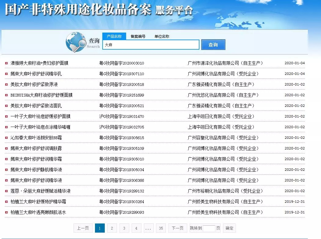 今年下半年,昆药集团、珍视明等相继推出了大麻护肤品。上月,国内大麻成分护肤品牌INBRIZ CBD完成数千万元融资;上美集团旗下一叶子也入局该领域,推出大麻成分面膜。据国家药监局非特殊用途化妆品备案系统显示,截至2019年12月31日,取得备案的“大麻”相关化妆品约480条。