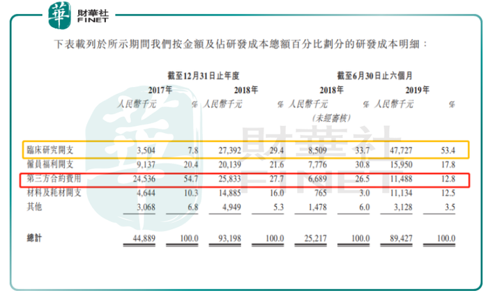 招股书显示,开拓药业的研发成本主要由四部分组成,分别是临床研究开支、雇员福利开支、第三方合约费用和材料及耗材开支。2017年,开拓药业的研发成本从44,889千元增加1.08倍至2018年的93,198千元,主要是因为在公司保持比例相当的第三方合约费用支出的同时,大幅增加了临床研究开支。
