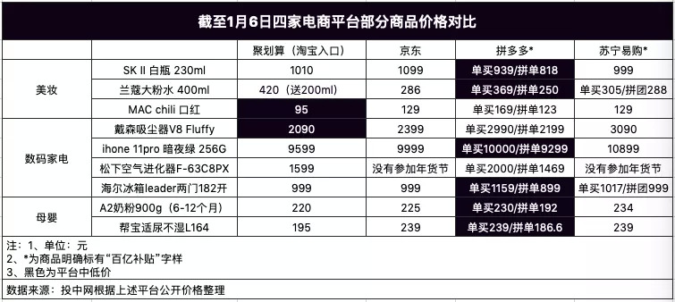 这也意味着,2019年下半年来,电商平台掀起的“百亿补贴”将会在2020年延续。投中网1月6日整理拼多多、京东、聚划算以及苏宁易购公开的商品品类时,便发现在开启的年货节期间,“百亿补贴”同样赫然标注在补贴的商品后缀。