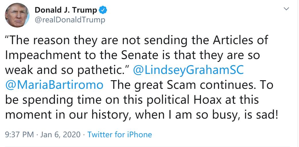 不过毫无疑问,中东局势升级有助于把美国公众的注意力从弹劾特朗普上转移,特朗普本人也认可这一点。在周一的Twitter里,特朗普写道:“在我们历史上的这个时刻,在我这么忙的时候,把时间花在这个政治骗局(弹劾)上,可悲!”