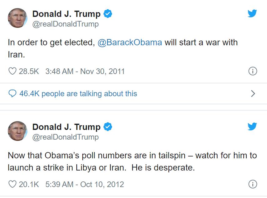 与此同时,特朗普多年前的Twitter也被翻了出来,显示他曾多次预测,自己的前任奥巴马一定会和伊朗开战来帮助连任。这证明,不论是否奏效,特朗普本人一直相信,军事行动有助于赢得选民支持。