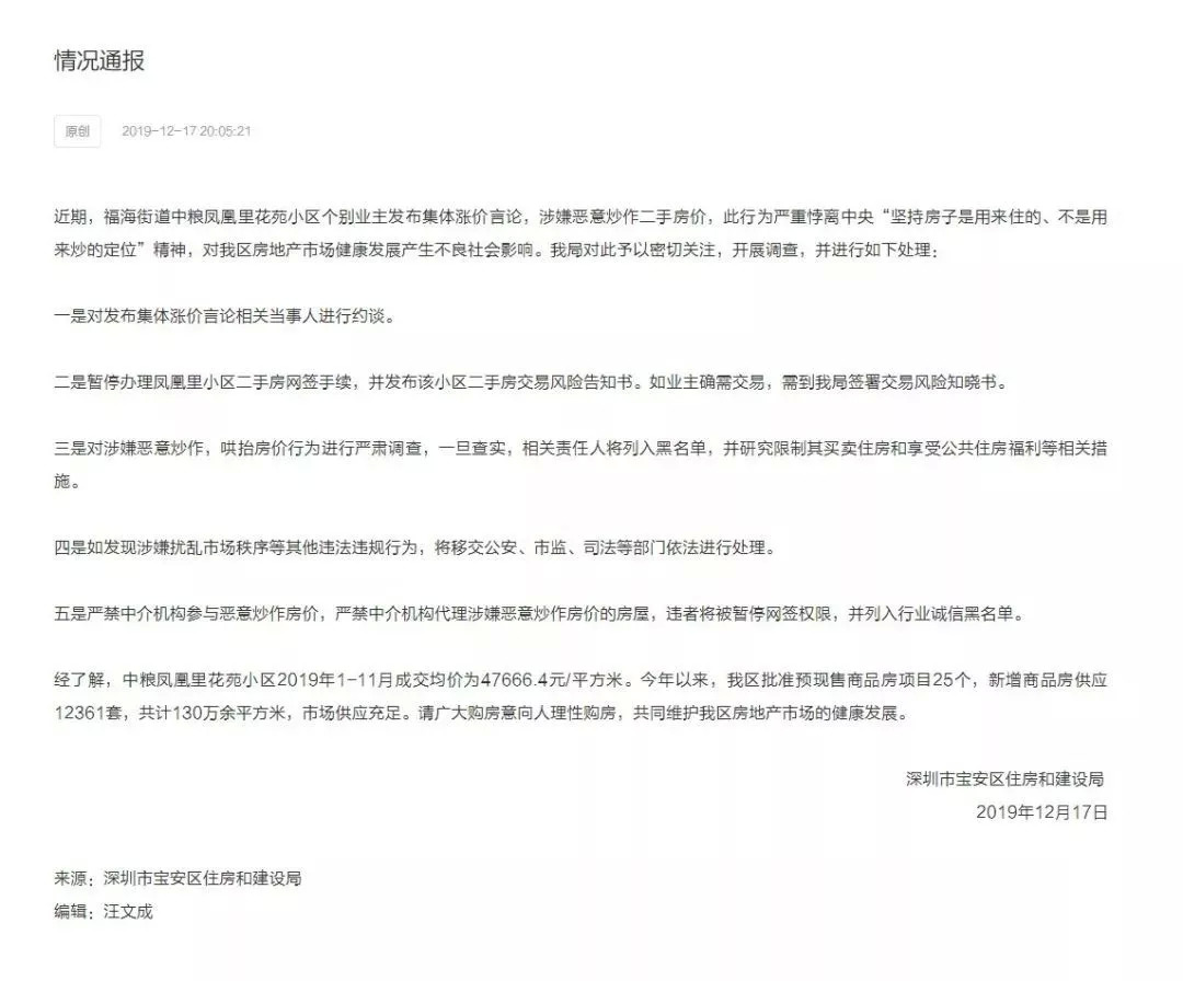 12月17日晚间,宝安区住建局率先对中粮凤凰里花苑小区发文通报批评,不仅约谈发布“涨价书”的业主,还暂停整个小区的网签,并发布该小区二手房交易风险告知书。
