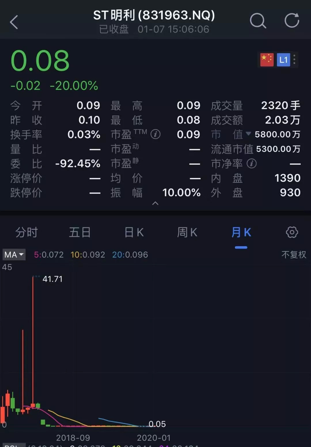 截至最新收盘,目前市值不到6000万,股价仅剩0.08元/股。