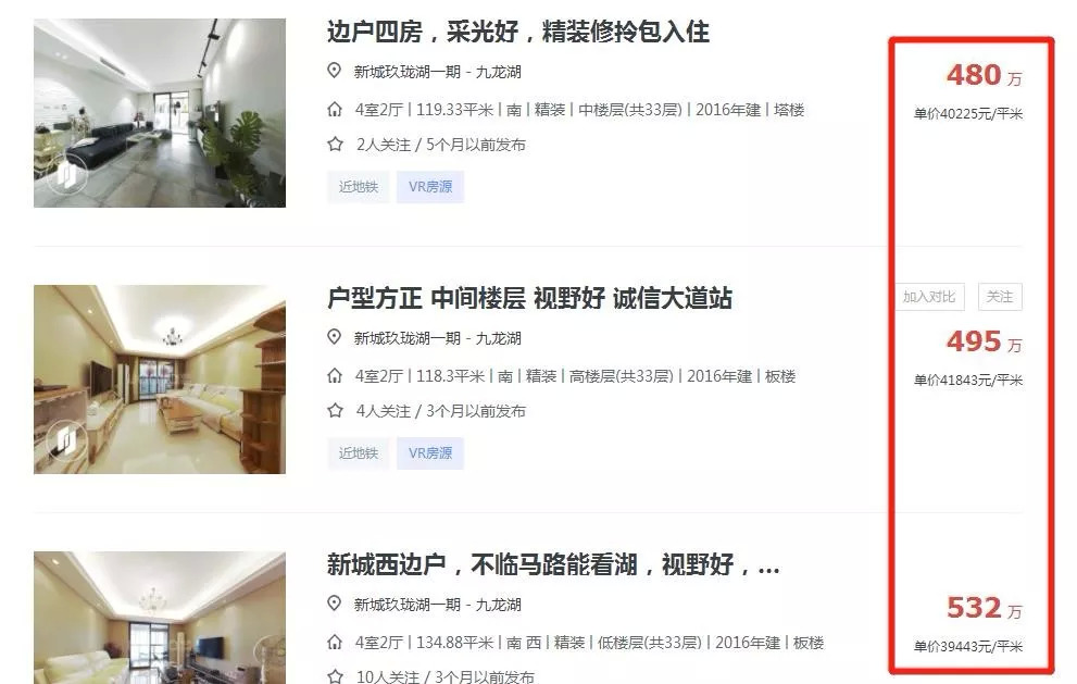 新城玖珑湖和骏景华庭所在的九龙湖板块早已陷入房荒,每有房源出山必定是争抢的对象。
