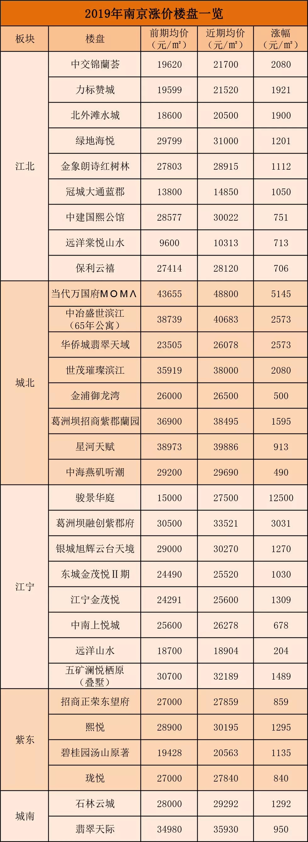 今年楼盘价格上涨已不是件新鲜事,据不完全统计,2019年南京已有31盘价格迎来了不同程度的涨价,其中,江北共有9家楼盘涨价,位列南京所有版块第一,其次是城北板块,共有6盘,31盘中涨价幅度最高的也当属城北鼓楼滨江的当代万国府ΜΟΜΛ,涨价5154元/㎡。