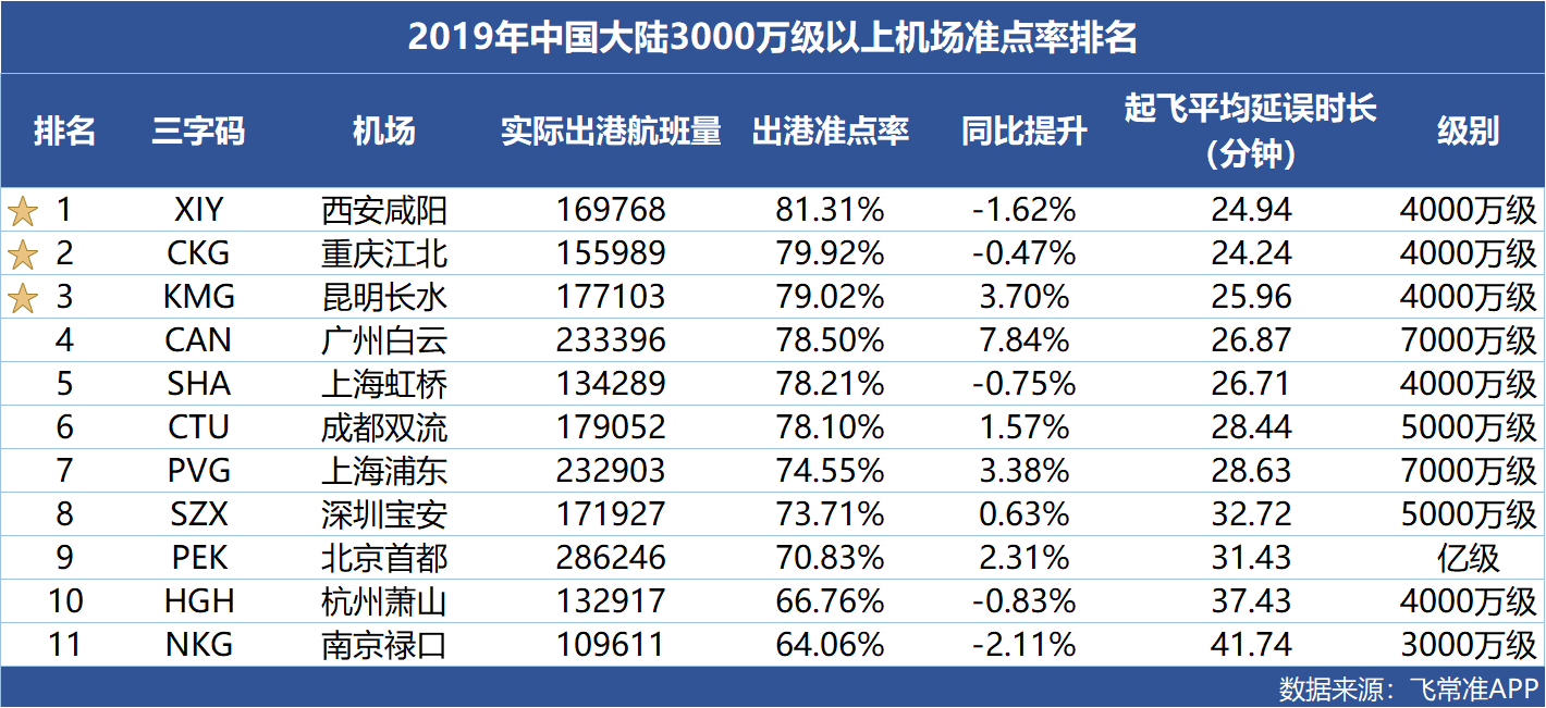 1月7日,飞常准APP发布《2019年全球机场&航空公司准点率报告》,报告显示,2019年中国大陆地区机场实际出港航班量达480.23万架次,出港准点率为75.57%,在全球出港准点率排行中占据第5位,起飞平均延误时长28.11分钟,准点率水平高于欧美国家。