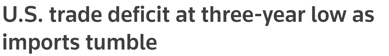 【美国进口锐减推动11月份贸易逆差降至三年多来低点】美国进口受贸易战影响进一步下降,加上出口反弹,推动11月份贸易逆差降至三年多来最低水平,预示着第四季度经济增长强劲。