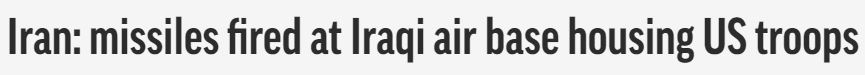 【伊朗向驻伊美军基地发射“数十枚”导弹】伊朗称其向驻有美军的伊拉克艾因·阿萨德空军基地发射了“数十枚”地对地导弹。伊朗国家电视台周三早间称,这是德黑兰方面对美国杀死伊斯兰革命卫队“圣城旅”指挥官苏莱曼尼的报复行动。