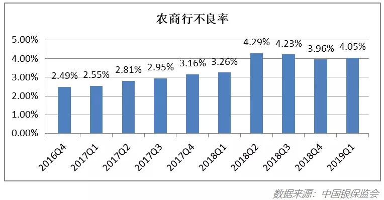 在高速发展的同时,整个农商行行业的不良率依然高企。上述A股上市的6家农商行截止2018年末的不良率分别为1.69%、0.97%、1.26%、1.31%、2.15%、1.47%。据中银国际证券研究数据,截止2019年1季度末,农商行整体不良率 4.1%,较2015年提升1.6个百分点,高于行业整体不良率 2.3个百分点,农商行不良率前十名都超过了5%,远远高于国有银行、股份制银行和城商行。