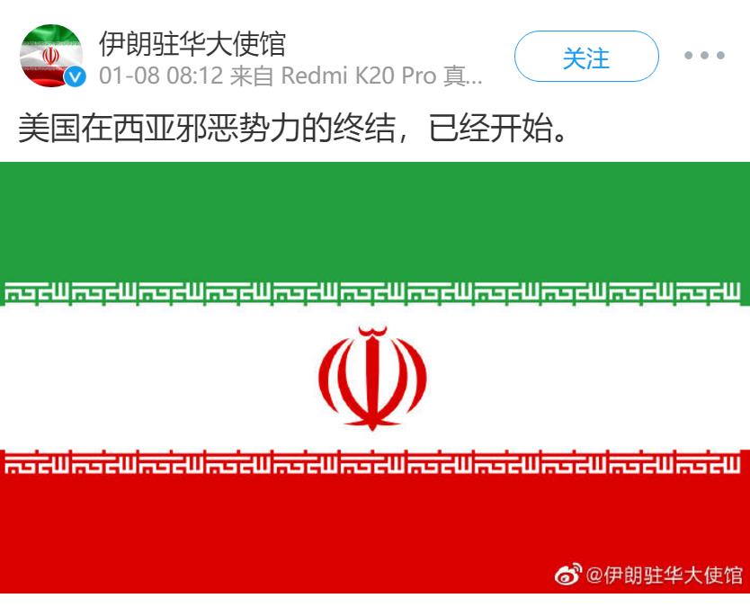 北京时间1月8日早8点左右,伊朗驻华大使馆发微博表示:“美国在西亚邪恶势力的终结,已经开始。”