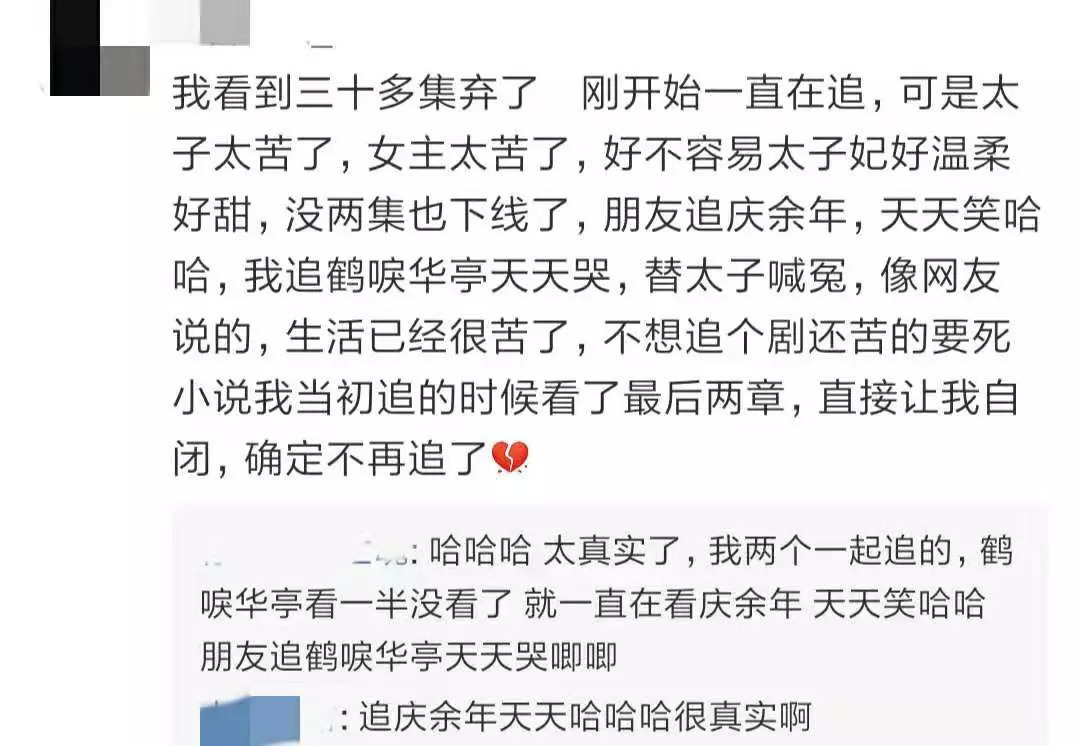 “我看到三十多集弃了。刚开始一直在追,可是太子太苦了,女主太苦了,好不容易太子妃好温柔好甜,没两集也下线了,朋友追《庆余年》,天天笑哈哈,我追《鹤唳华亭》天天哭,替太子喊冤。像网友说的,生活已经很苦了,不想追个剧还苦的要死,小说我当初追的时候看了最后两章,直接让我自闭,确定不再追了”