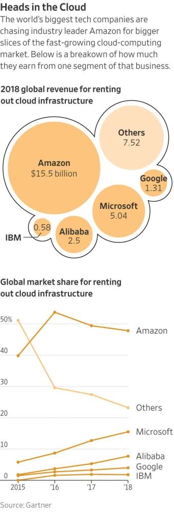 目前而言,亚马逊是云计算领域无可争议的领导者,但这种优势正在缩小。根据市场研究公司Gartner的数据,2018年亚马逊在云基础设施租用服务的市场份额为47.8%,低于上一年的49.4%和2016年的53.7%。据Gartner的数据,微软是全球第二大公共云服务提供商,2018年其市场份额为15.5%,高于上年的12.7%和2016年的8.7%。