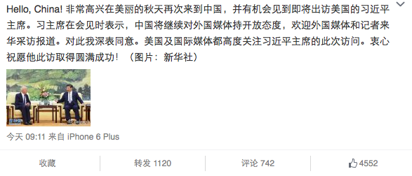 图为9月18日,他在人民大会堂接受中国国家主席习近平的接见。微博当中赞赏了习近平主席对外国媒体的开放态度。当然还不忘宣传一下自己,微博中他表达了对习主席访美的期待与祝福,还表示新闻集团旗下《华尔街日报》等多家媒体将会对习主席访美之行进行全面的报道。