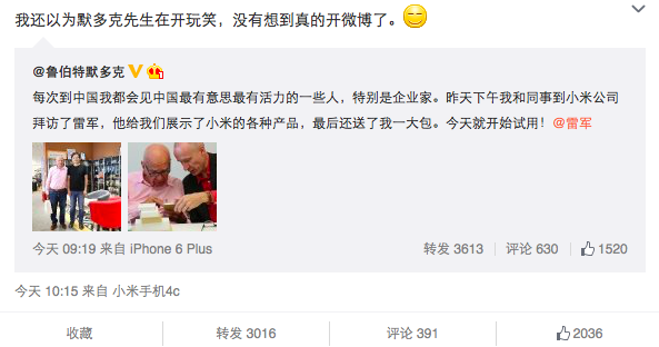 第二条微博,讲述他在访华期间,参观了小米公司。并且还艾特了雷军。雷军也及时作出了回应,表示意料之外。只是,不知道雷军先生与默多克的英语交流还顺畅不?