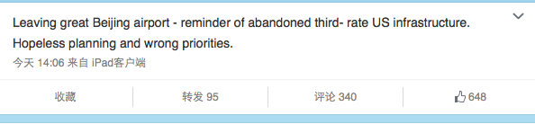 “离开了伟大的北京机场,想起了放弃治疗后三流水平的美国基础建设,让人绝望规划和错置的资源配置。”