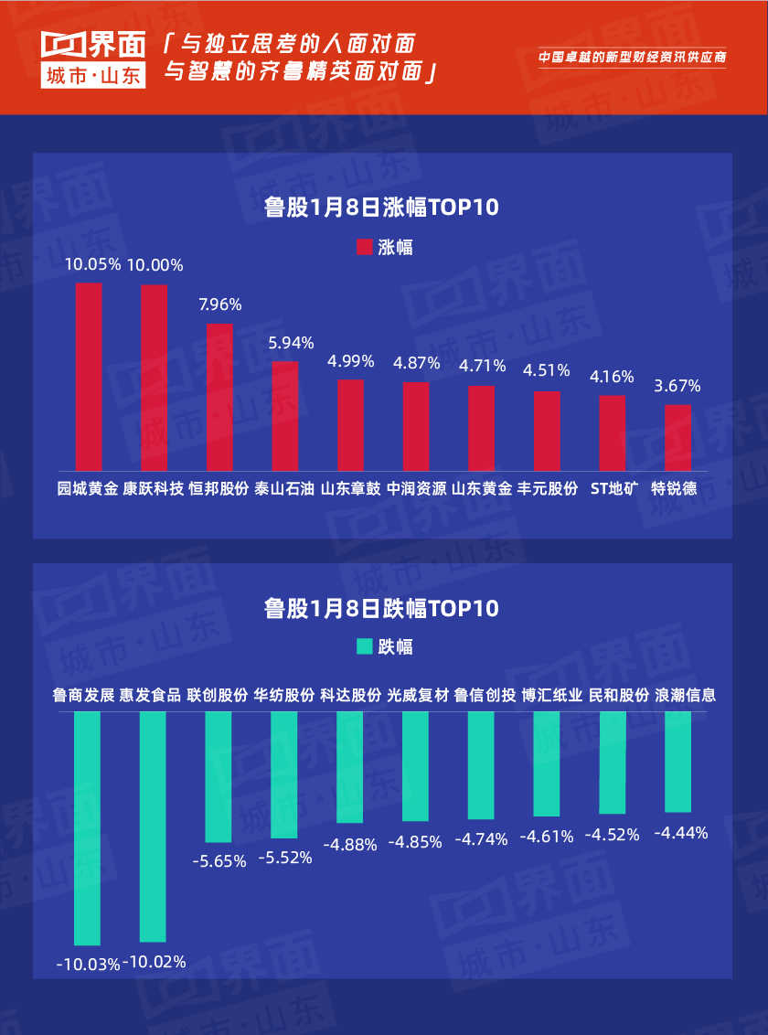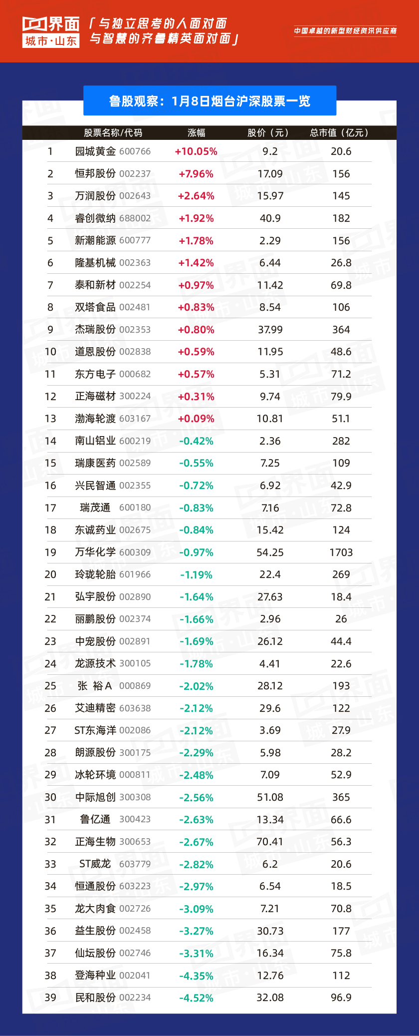 1月8日,山东省内沪深股票有36只个股上涨,171只下跌;