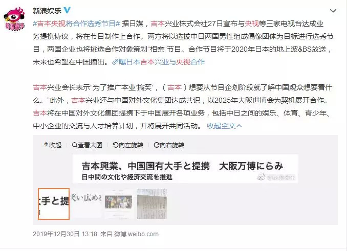 万万没想到,2019年末,央视还又来了个大动作。日本吉本兴业株式会社宣布与包括央视在内的三家电视台达成业务提携协议,在节目制作上进行合作。