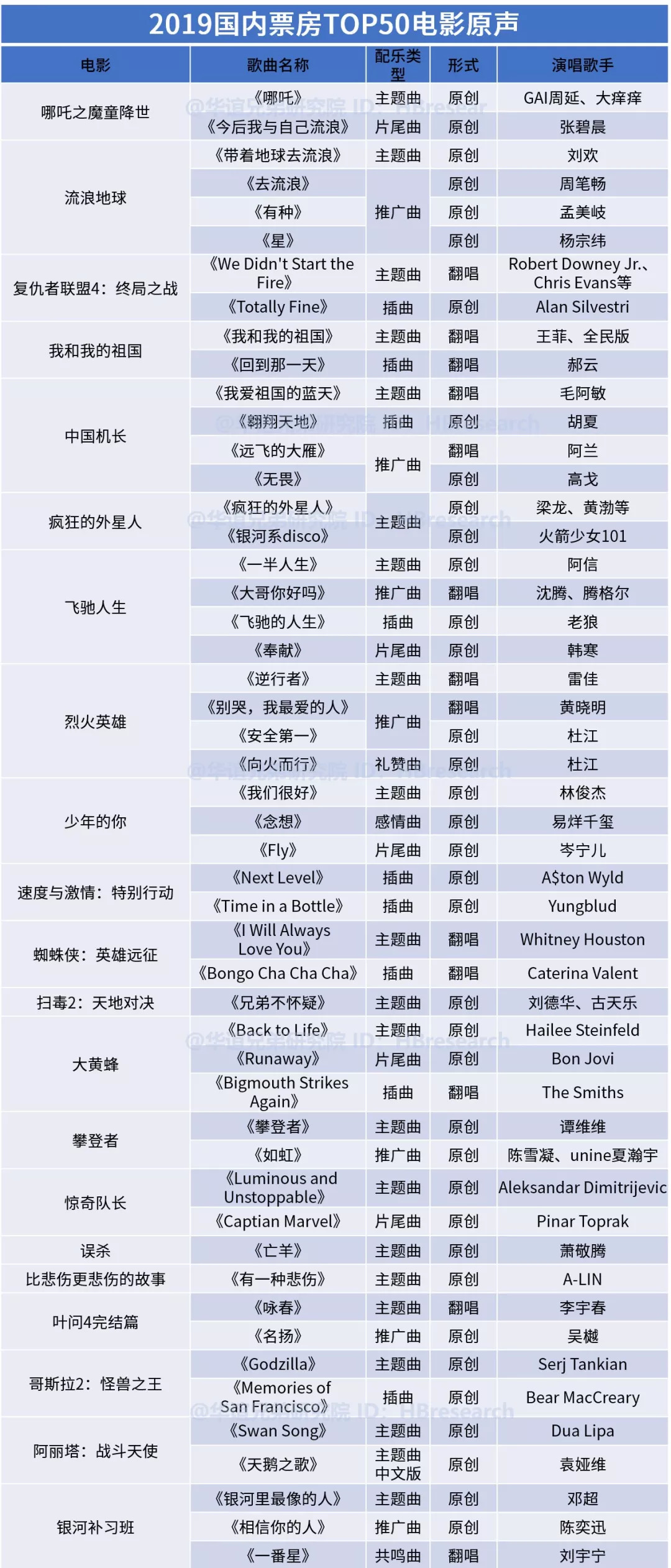 今天,华谊兄弟研究院(ID:HBresearch)将回顾2019年国内票房前五十电影榜单,从这些影片的原声(包括配乐、主题曲、推广曲等)来讨论影视音乐对流量的聚合效应、以及对影视营销的联动作用。