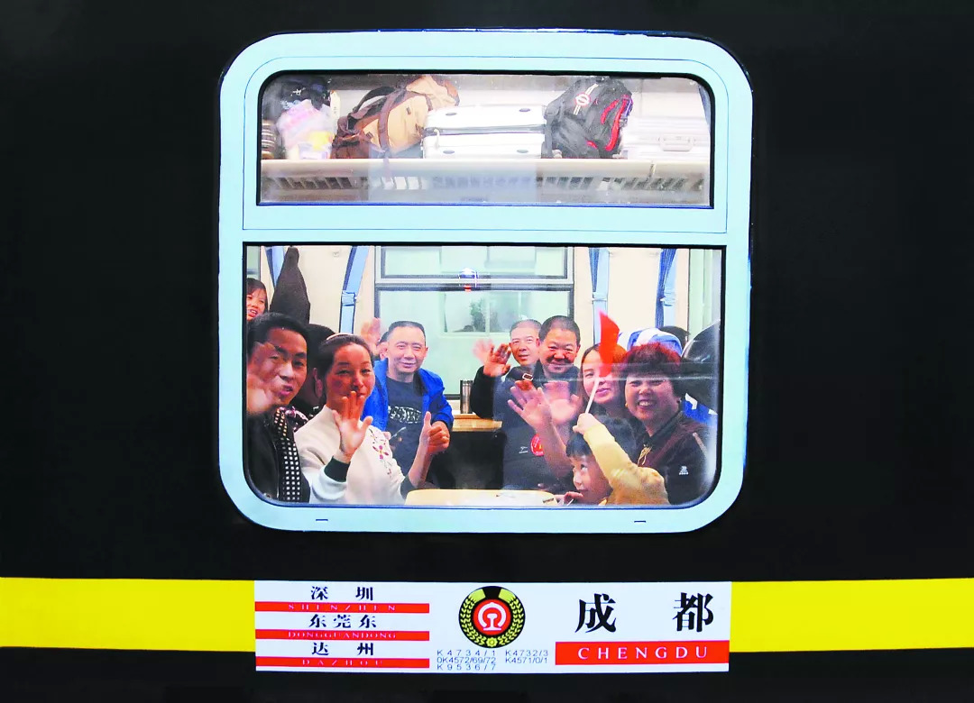 2019年1月21日,春运拉开帷幕。铁路部门坚持以人民为中心的发展思想,聚焦交通强国、铁路先行使命任务,推出多项便民利民新举措,为春运做足准备,努力实现“平安春运、有序春运、温馨春运,让旅客体验更美好”的目标,进一步提升广大旅客的获得感、幸福感和安全感。图为春运期间,旅客在加开列车上挥手告别、准备返乡。石本驹 摄