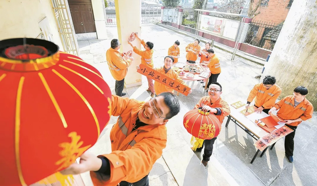 2019年2月4日是农历除夕。在阖家团圆的日子里,许多铁路职工坚守岗位放弃与家人团聚。铁路各单位积极开展亲情陪伴活动,组织干部深入一线,和职工一起包饺子、贴春联,让广大职工备感温暖。图为南昌电务段职工在工区挂灯笼、贴对联,庆祝新春佳节。鲍赣生 摄