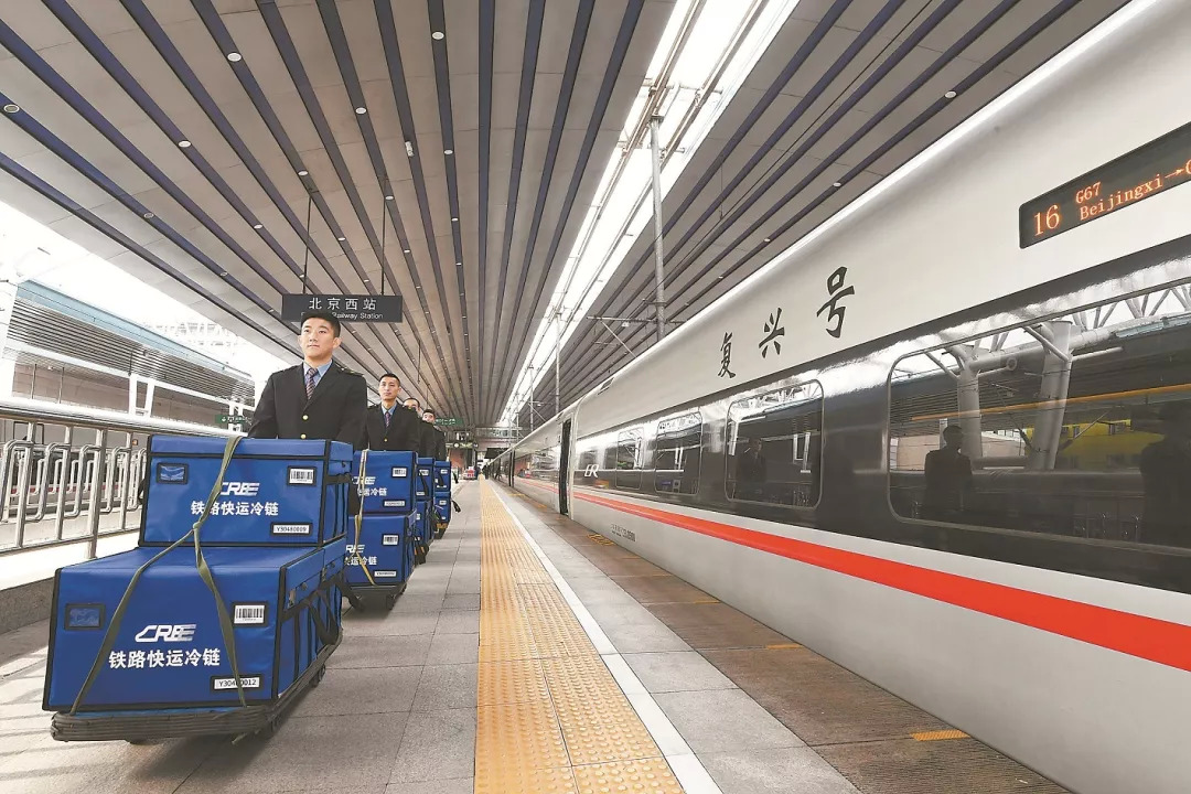 2019年11月11日至20日,铁路启动“双11”电商黄金周运输,充分利用高铁安全快捷和成网运行优势,投入多种运力资源,对接市场需求,以精准运输、精心服务、精细管理,展示国铁企业发展新气象、新作为,助力快件早日到达消费者手中。图为铁路工作人员在运送“双11”的“新武器”——新型专用冷链箱。佟一博 摄