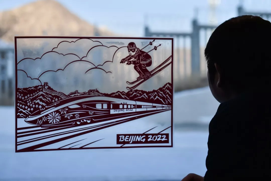 2019年12月30日,北京至张家口高速铁路开通运营,崇礼铁路同步建成投产,时速350公里复兴号智能动车组在世界上首次实现自动驾驶,进一步提升我国高铁领跑全球的优势。这两条铁路将助力京津冀一体化协同发展,为北京冬奥会提供交通运营服务保障。图为北京北开往太子城的G8811次列车上,车窗贴着2022年北京冬奥会主题的剪纸。彭子洋 摄