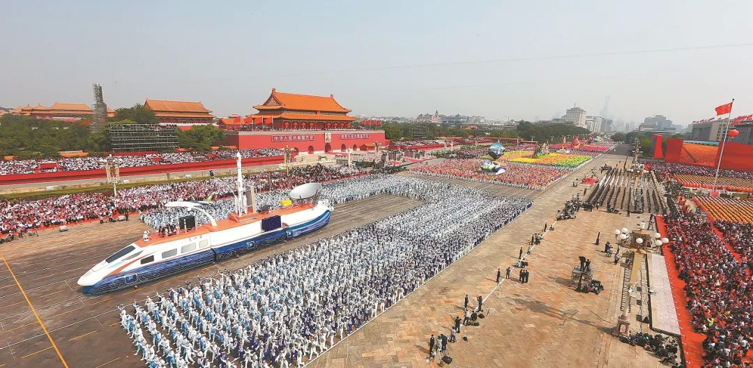 2019年10月1日上午,庆祝中华人民共和国成立70周年大会在北京天安门广场隆重举行。在群众游行第三篇章“伟大复兴”中,以复兴号为代表的铁路元素多次出现,为“同心共筑中国梦”主题增添了光彩。新华社记者 琚振华 摄
