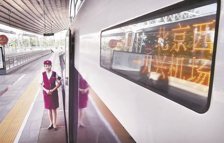 2019年9月26日,京雄城际铁路北京西至大兴机场段正式开通运营。跑出世界高铁商业运营最高速度的复兴号列车贴地“飞入”全球最大规模单体航站楼——北京大兴国际机场航站楼,为新中国70岁生日献礼。图为京雄城际铁路北京西至大兴机场段首趟复兴号准备发车。杨宝森 摄