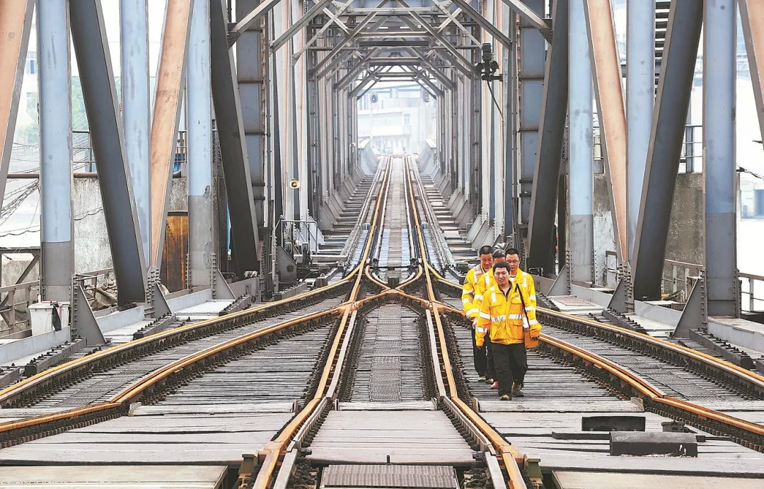 劳动最光荣。千千万万铁路职工在五一小长假期间坚守一线履职尽责,确保铁路运输安全畅通,尽心尽力让旅客的出行体验更美好,在平凡岗位上书写着一个个铁路故事。图为上海电务段无锡西信号工区职工在巡查栈桥三开道岔状态。刘一嬴 摄