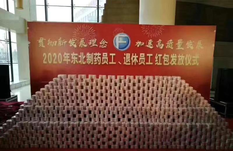 1月8日,微信朋友圈流转着一张图片,上面写着“2020年东北制药员工、退休员工奖金发放仪式”的字样,在字幕板前面还摞了一堆红包现金小山堆。