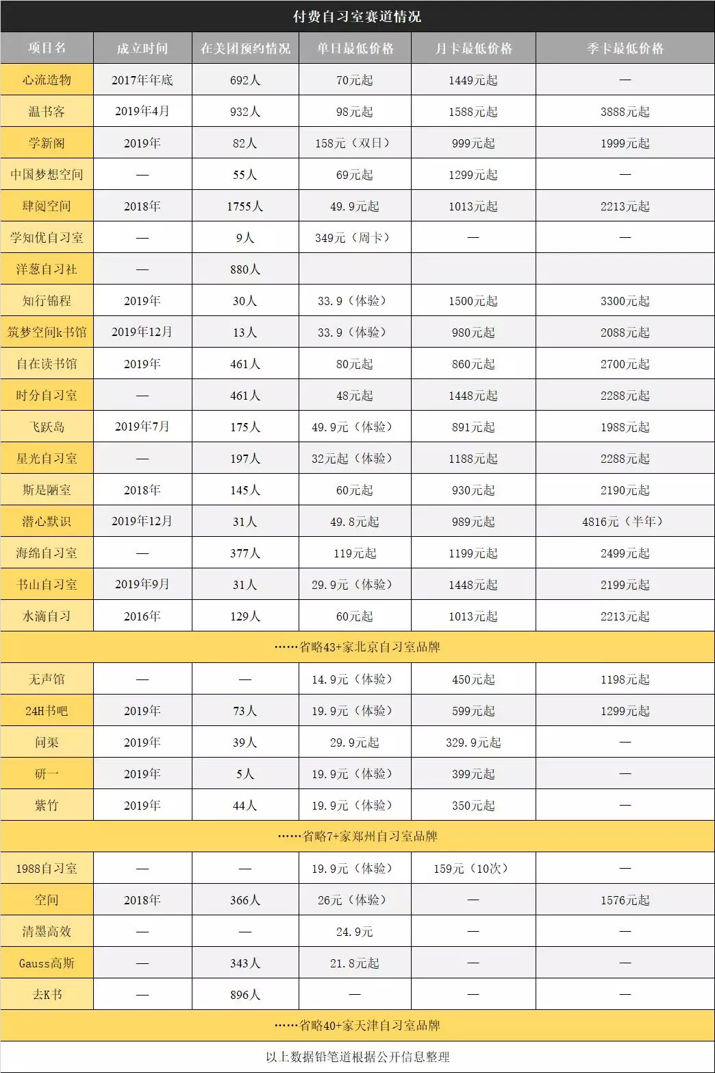 “2019年9月,厦门首家付费自习室青屏书馆开业;2019年11月,厦门另一家静竞沉浸式自习室开业;2019年12月,位于北京的付费自习室潜心默识开业;同月,北京的另一家筑梦空间k书馆开业……