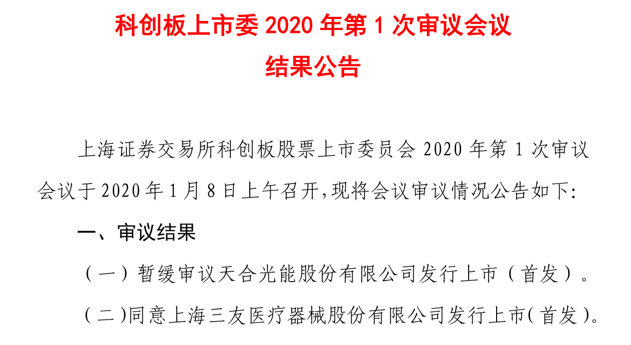 科创板2020年首发上会的企业,是三友医疗和天合光能,但最终三友医疗获得了通过,而天合光能的状态是“暂缓”。