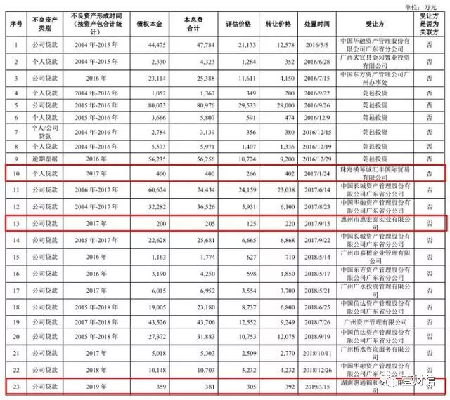 上图中还显示,2018年7月26日,东莞银行向广州资产管理有限公司(下称“广州资管”)转让了一笔公司贷款类的不良资产,本息合计43,706万元,评估价格为12,552万元,转让价格为9,249万元,转让价格仅为本息合计金额的两折多一点。