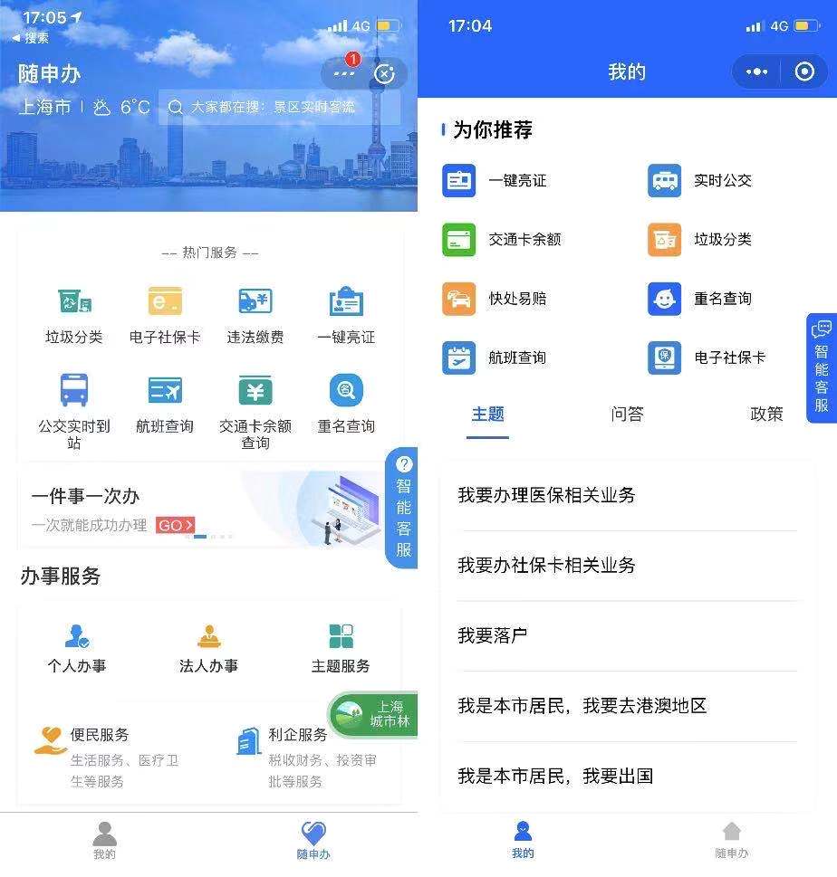 “随申办”是上海市“一网通办”移动端政务服务品牌,以“随申办”、“我”、“社区服务”等三大频道为主要服务版块,汇聚800余项政务服务事项。