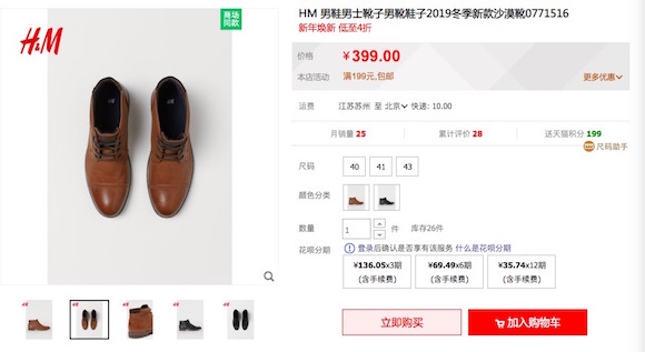 界面新闻在H&M官网上并没有找到这款产品,但H&M天猫旗舰店中依然有售,单价为399元。