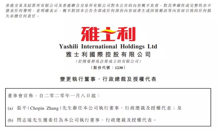 昨晚,雅士利国际在联交所发布公告,披露该集团行政总裁张平因家庭原因已辞任执行董事及行政总裁,同时将被委任为雅士利国际附属公司新西兰雅士利乳业有限公司的顾问。