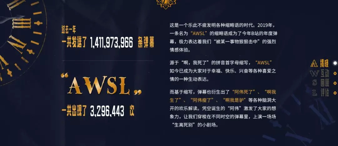 B站年度弹幕AWSL,是汉语“啊我死了”的汉语拼音首字母。后来被饭圈少女衍生出了“啊,我生了”“啊,我酸了”,抒发了当代年轻人面对喜爱的东西时“被狠狠击中”的情感体验。