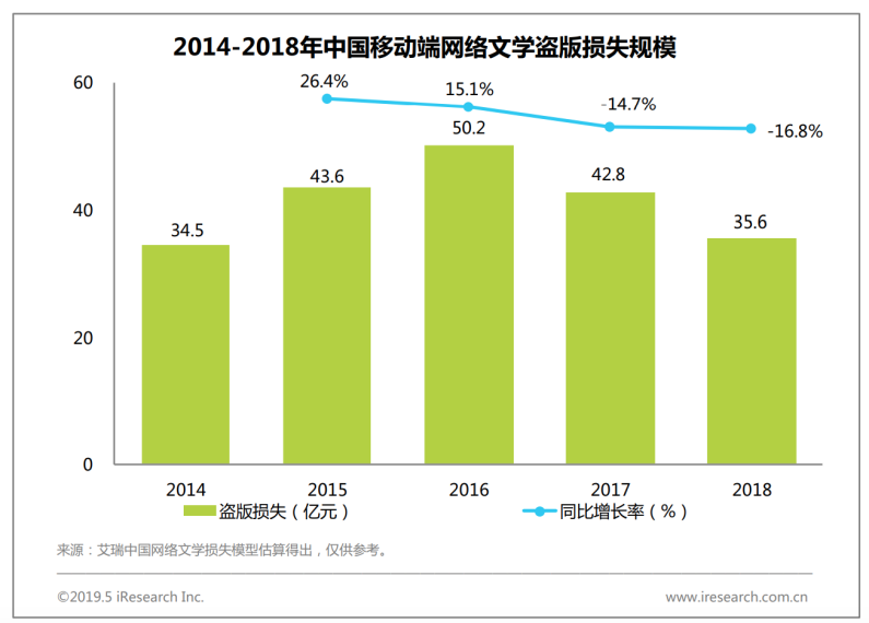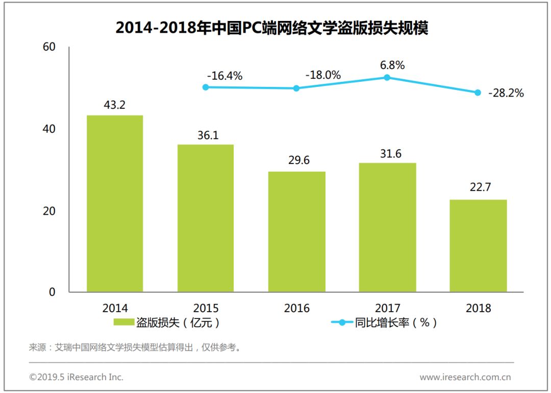 根据艾瑞数据统计,2018年中国网络文学整体盗版损失规模为58.3亿元,相较2017年降低了21.6%。