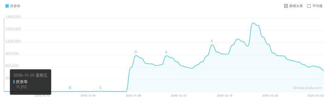 从百度指数来看,自11月末该剧播出起,“庆余年”关键词在百度搜索量从11月初的单日1万飙升到12月20日的168万,增长超150倍。