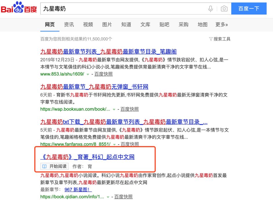 记者在百度中搜索小说网站时发现,许多小说的正版链接是出现在盗版网站之下。搜索起点中文网热门小说,前三条显示结果均为盗版网站。