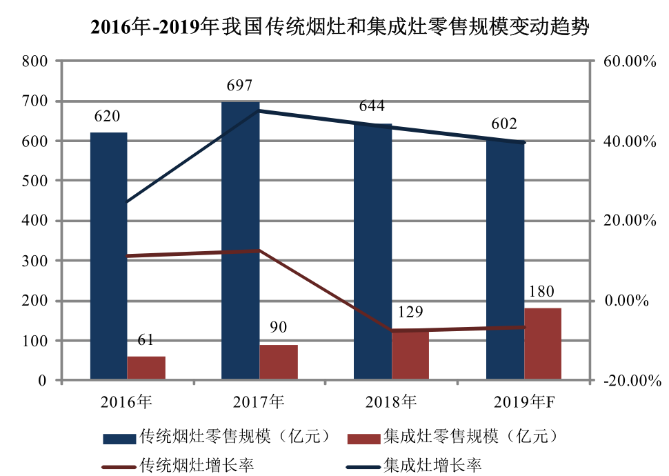 在厨电行业普遍下滑的背景下,集成灶这一细分产品却发展势头迅猛,成为“冬天里的一把火”。2018年,我国集成灶零售规模同比增长43%,达到129亿元。家电咨询机构中怡康预测,2019年集成灶零售规模有望达到180亿元,这意味着40%的增长。